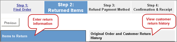 Step 2 has two tabs that provide return processing and return history.