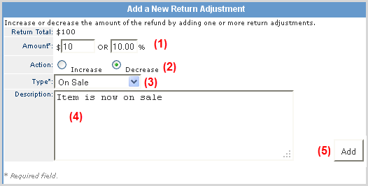 Note: Adjustments Types are setup in System Admin > Technical Configuration > Return Adjustment Types . |