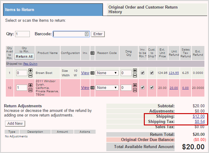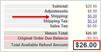 Click on the Shipping and Shipping Tax links to refund fees. Note that the Shipping and Shipping Tax lines display the amount from the original order but are not refunded unless you click on the links and enter an amount to be refunded.