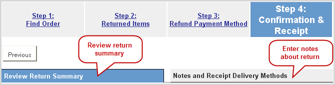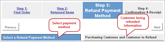 Step 3 has two tabs that provide return payment processing and capture of information for the customer being refunded.