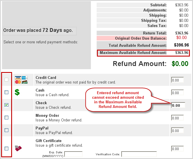 The payment method screen displays the number of days since the original purchase and itemizes all adjustments, taxes and total refund to be paid to the customer. Check the box for the refund method type and enter the amount of the refund in the corresponding amount field.