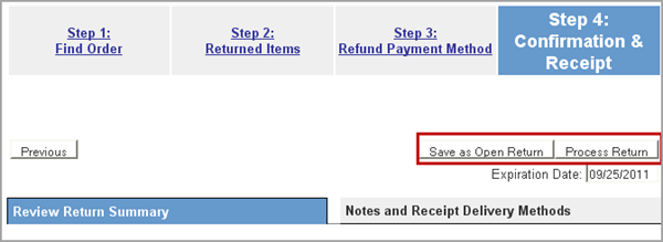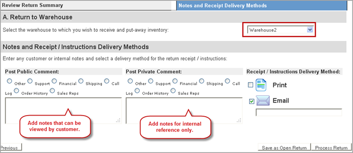 Click on either Save as Open Return or Process Return. Click on Process Return to complete the return and close it. Save as Open Return issues an RMA and saves the return for closing until returned items are received. |