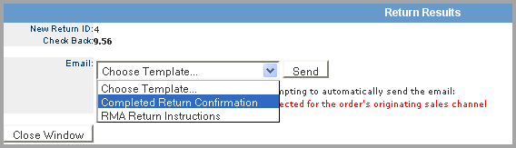 If you Process the Return, the system assigns a Return ID and prompts you to select the type of email template to be sent to the customer.