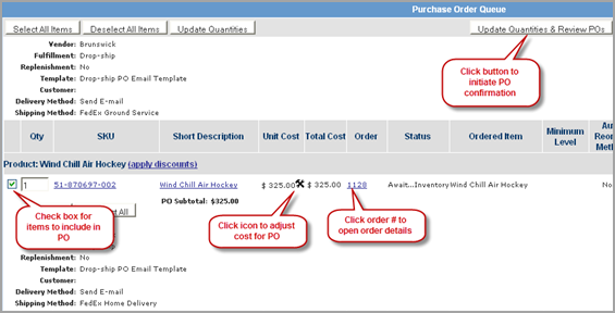 In PO Queue, review items that you want to create a PO for and check or uncheck the box to include them. Filter the pending PO items by: Vendor. Warehouse, Fulfillment Type, Order #, SKU ID and/or Sales History.