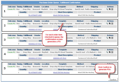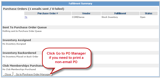 Once confirmed, the Fulfillment Summary lists whether an email or document was generated for the vendor. Emails are automatically sent to the vendor, printed documents need to be accessed from the PO Manager and mailed/faxed to vendor.
