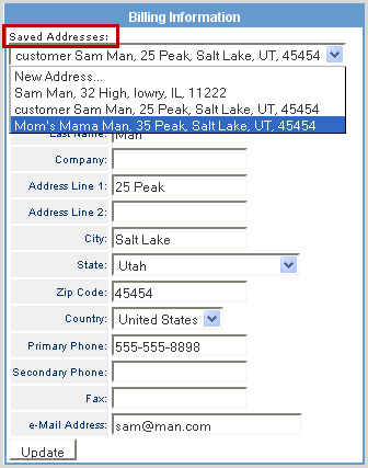 To change the current address to another address already on record, click on the Saved Addresses drop-down and select the desired address from the list and click Update.