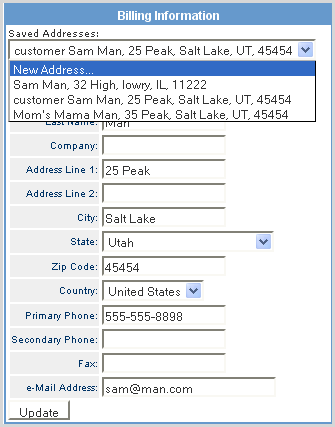 The fields are cleared so that you can enter the new information. Once the address is complete, click on Update to save the address so that it is available in the drop-down list for future use. |
