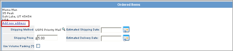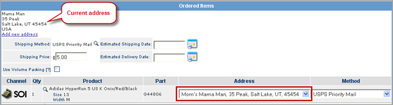 From the Shipping tab, view the current shipping address in the top left section of the Ordered Items box. To select a stored address, click on the drop-down list under the Address column and select an address.