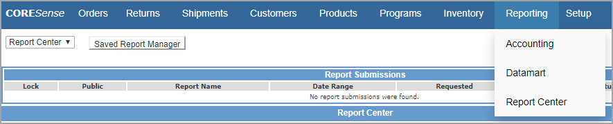 CORESense Reporting is managed under the Reporting section. Reports are organized under the Accounting, Datamart or Report Center options. The report types are described in the table below. The system cyclically searches for orders that have been shipped in the Account Summary table that are then available in the Financials section of the Accounting report types.